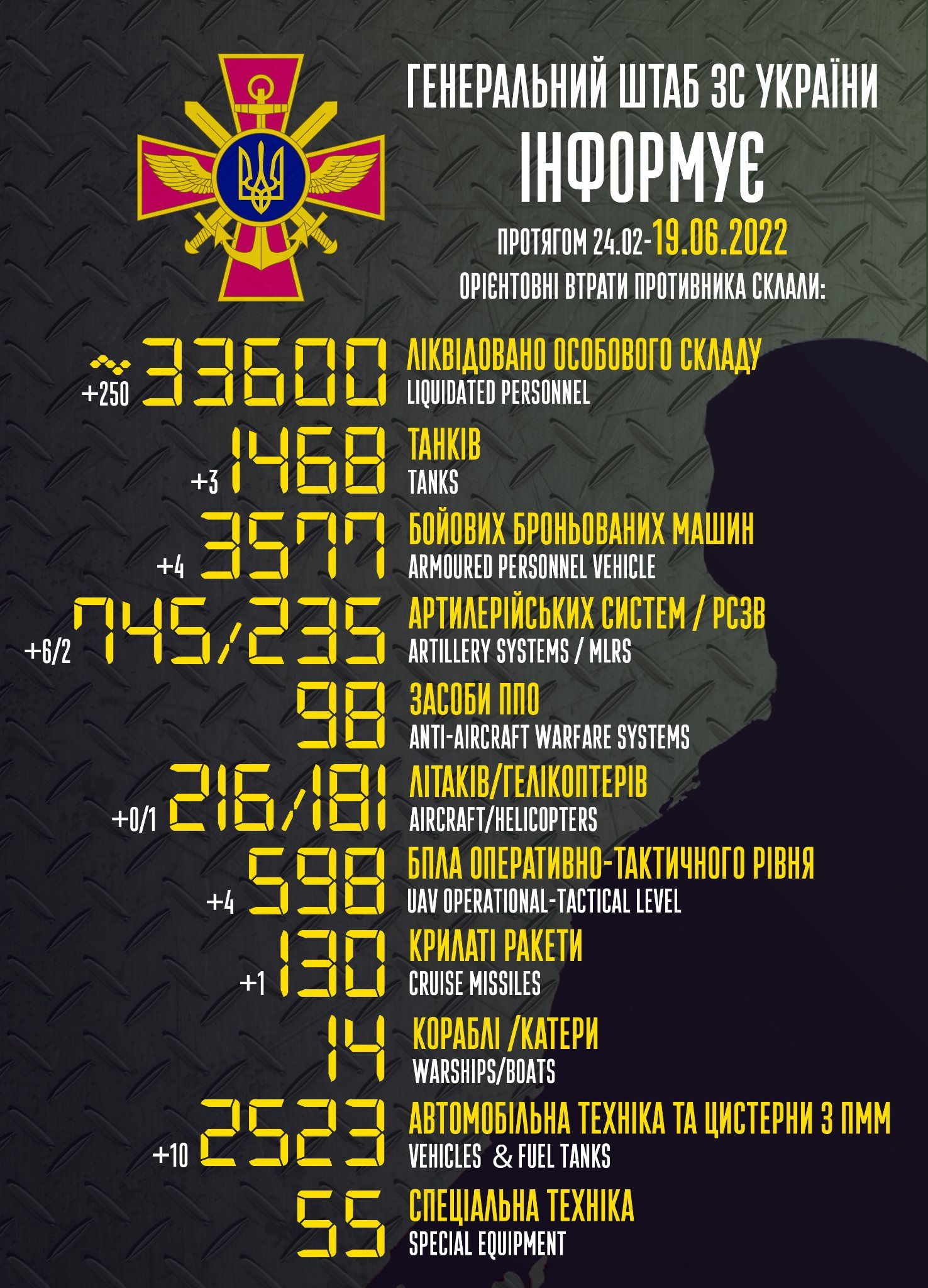 19 Червня 2022, 12:15Від початку повномасштабної агресії рф проти України з 24 лютого по 19 червня, загальні втрати живої сили ворога сягають приблизно 33600 осіб. Про це повідомляє РеІнформ з посиланням на Генеральний штаб ЗСУ.
