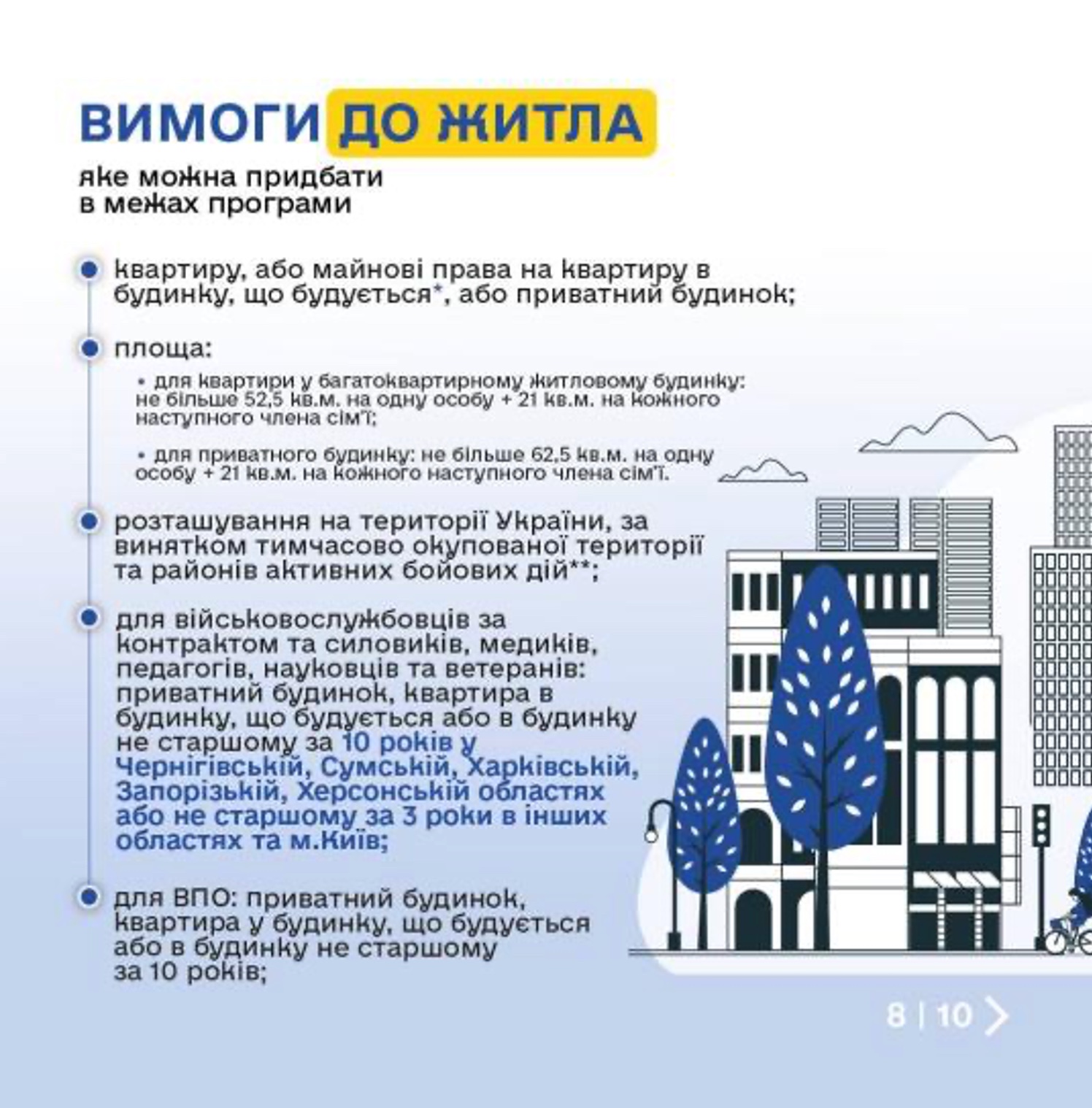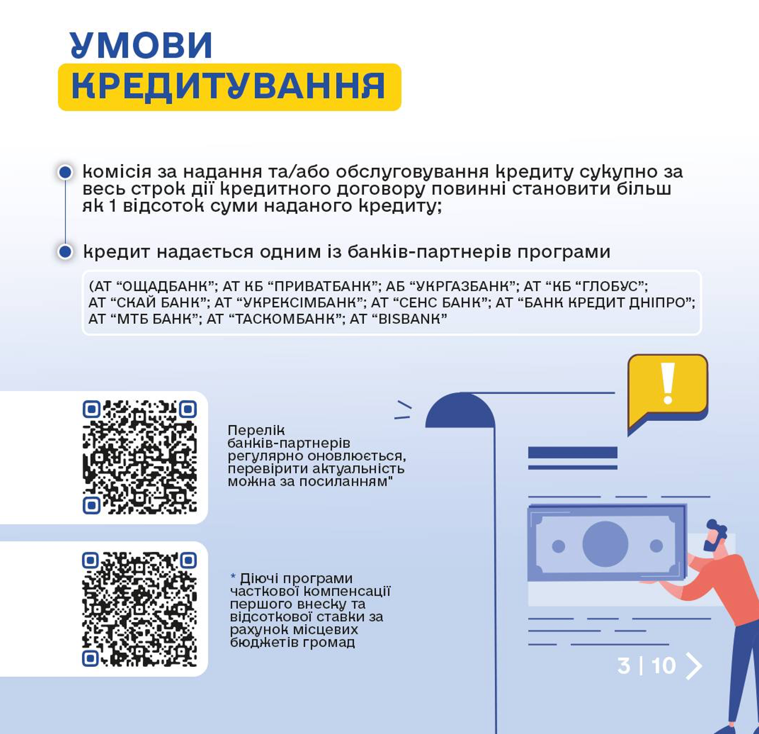 Зазначається, що початковий внесок для людей віком до 25 років, становить не менше 10% вартості предмета іпотеки; для людей віком від 26 років – не менше 20% вартості предмета іпотеки. Його можна сплатити за рахунок одного або кількох житлових сертифікатів, отриманих за знищене житло.
