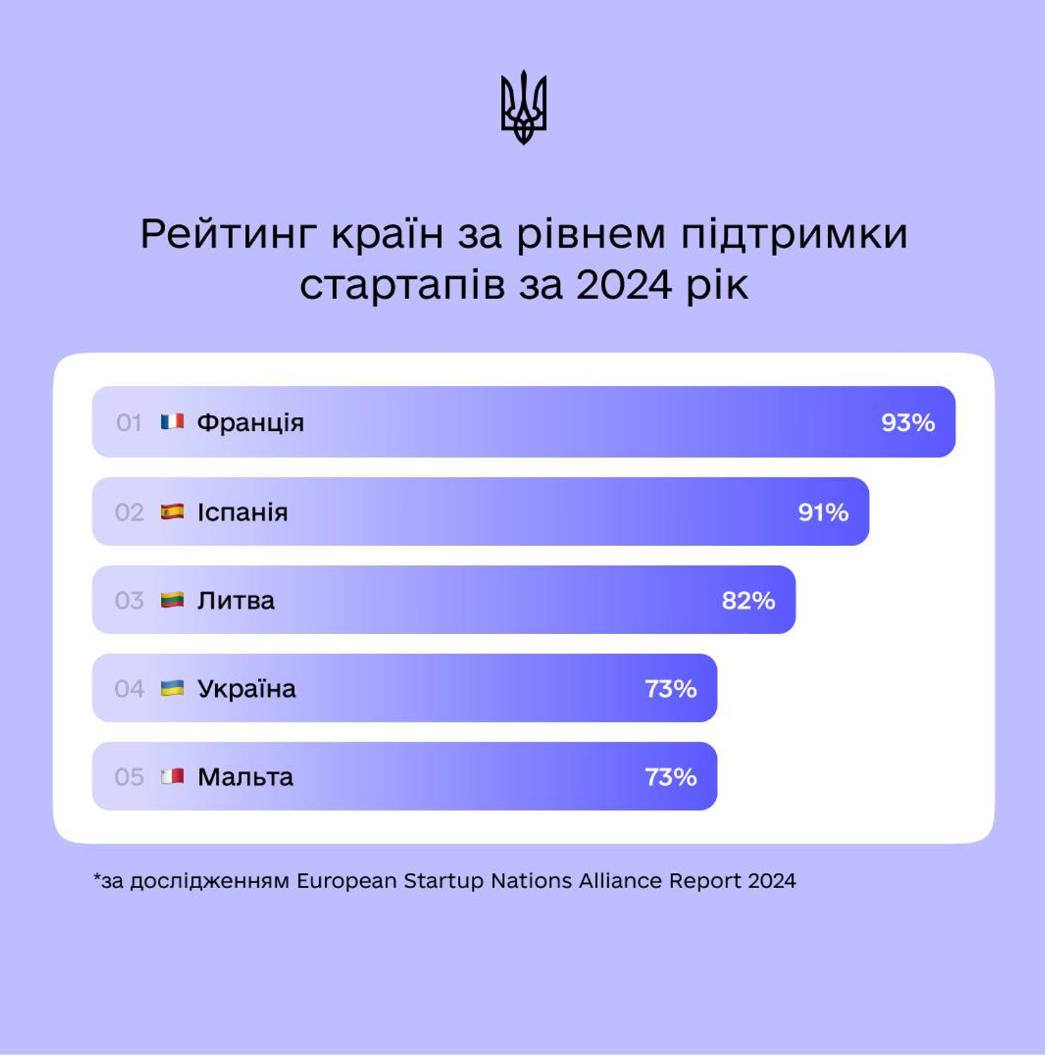 Україна посіла четверте місце серед 24 країн ЄС за рівнем підтримки стартапів, відповідно до звіту European Startup Nations Alliance за 2024 рік. Рейтинг оцінює, наскільки ефективно країни створюють умови для розвитку та масштабування технологічних компаній.
