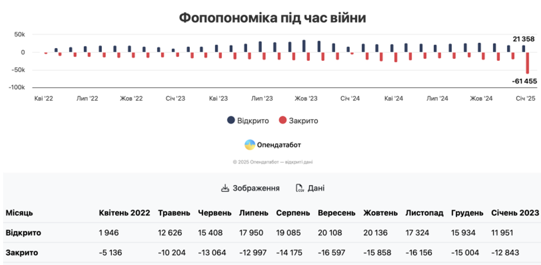Аналітики платформи зауважують, що попри ризики війни, відкриття бізнесів било рекорди: відтоді, як реєстри запрацювали у березні 2022 року, щомісяця більше ФОПів відкривалося, ніж закривалося.