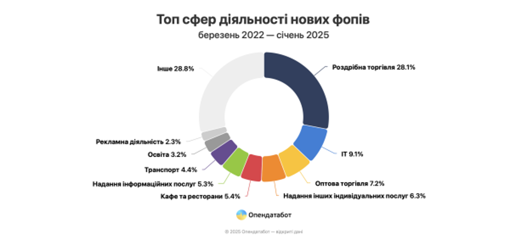 До трійки також потрапили IT – 9,1% (69,5 тисячі) та оптова торгівля – 7,2% (54,6 тисячі). Водночас зазначається, що до повномасштабного вторгнення нових айті-ФОПів на місяць реєструвалося майже вдвічі більше.