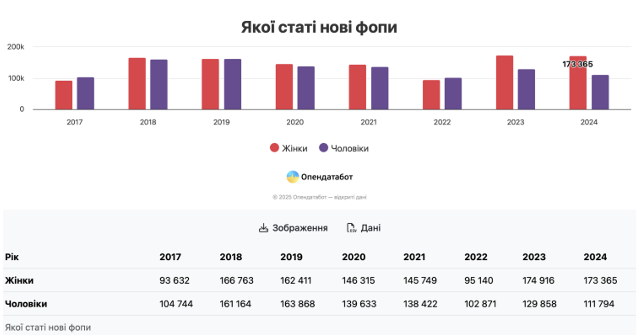 Також аналітики платформи вказують, що повномасштабна війна та мобілізація помітно вплинули на гендерний розподіл підприємців. Таким чином, якщо у січні 2022 року кожен другий новий ФОП відкривали жінки, то зараз частка таких справ – 61%.
