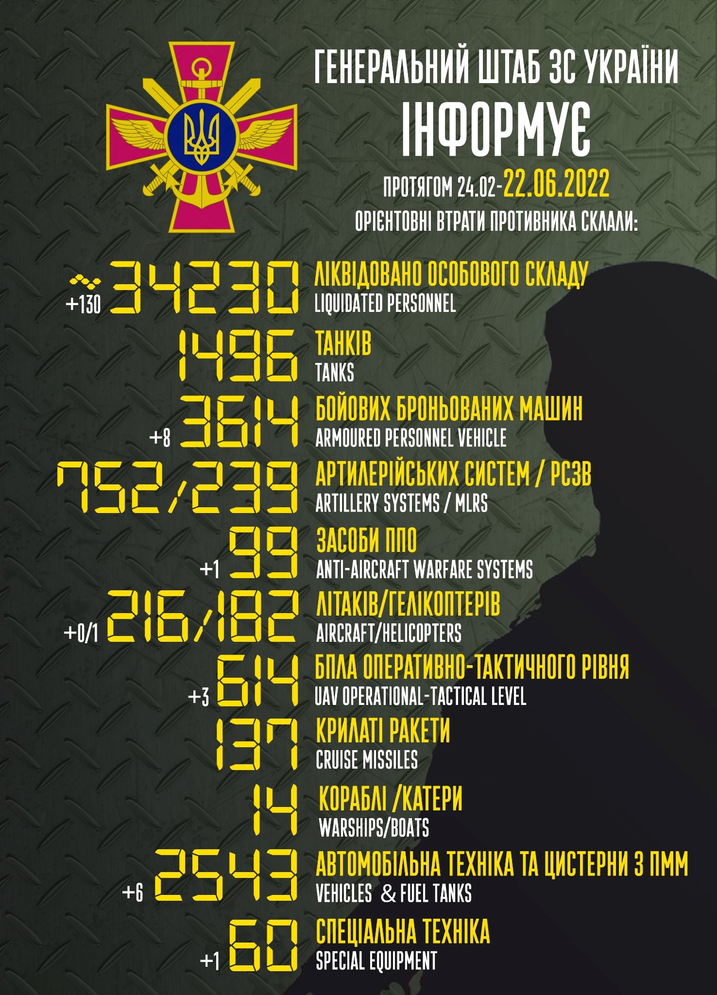 Від початку повномасштабної агресії рф проти України з 24 лютого по 22 червня загальні втрати живої сили ворога сягають понад 34,2 тис. осіб.