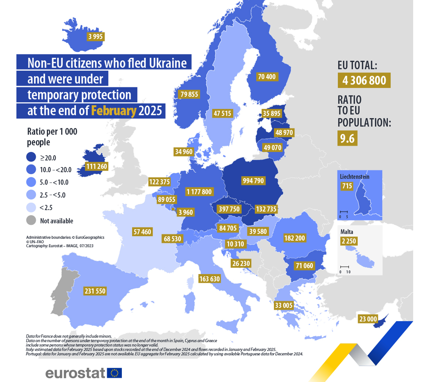 Порівняно з кінцем січня 2025 року загальна кількість осіб із тимчасовим захистом на кінець лютого в ЄС зросла на 21 015 (+0,5%) і становила 4 306 800.