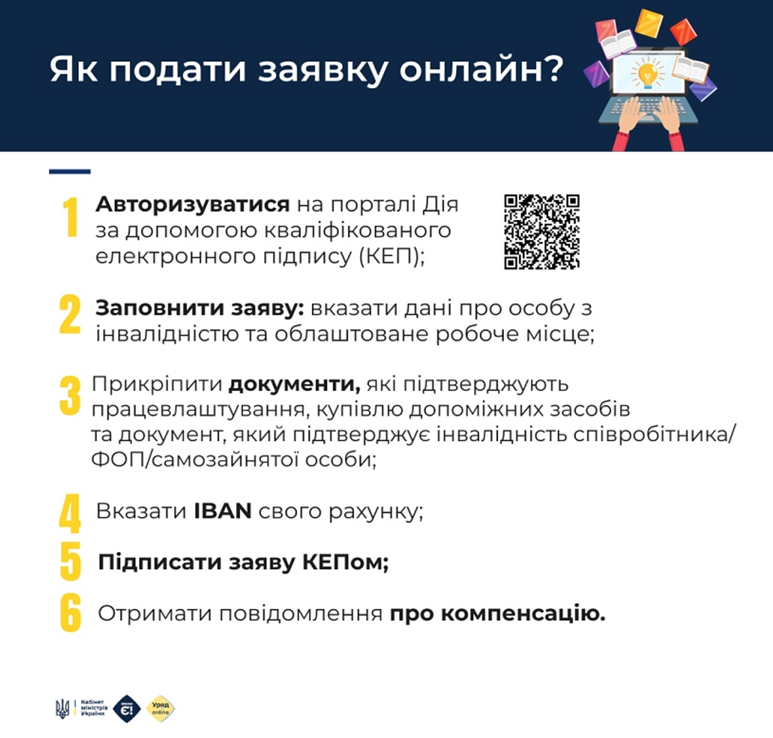 Щоб скористатися програмою компенсації, роботодавці мають працевлаштувати людину з інвалідністю та забезпечити її робочим місцем або облаштувати власне місце провадження господарської діяльності/незалежної професійної діяльності, якщо заявником є ветеран з інвалідністю.