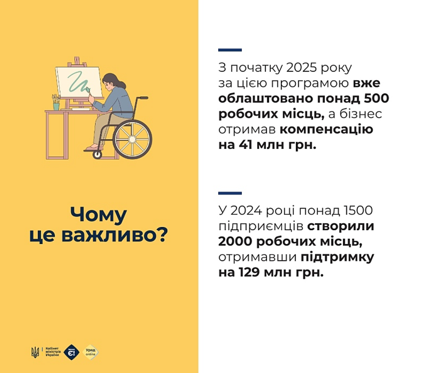 За облаштування робочих місць для людей з інвалідністю можна отримати компенсацію: до 120 тисяч гривень — для осіб І групи, 80 тисяч гривень — для осіб ІІ групи.
