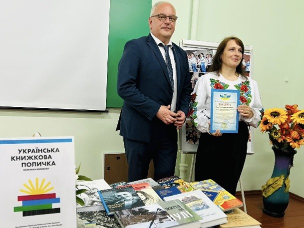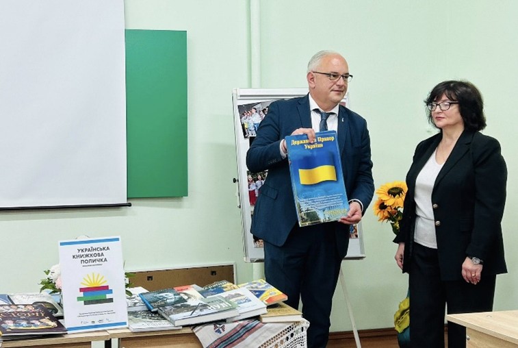Окрім книжок, гімназія отримала також плакати з українською символікою та навчальні матеріали. Ці подарунки сприятимуть глибшій інтеграції українського контенту в освітнє середовище.