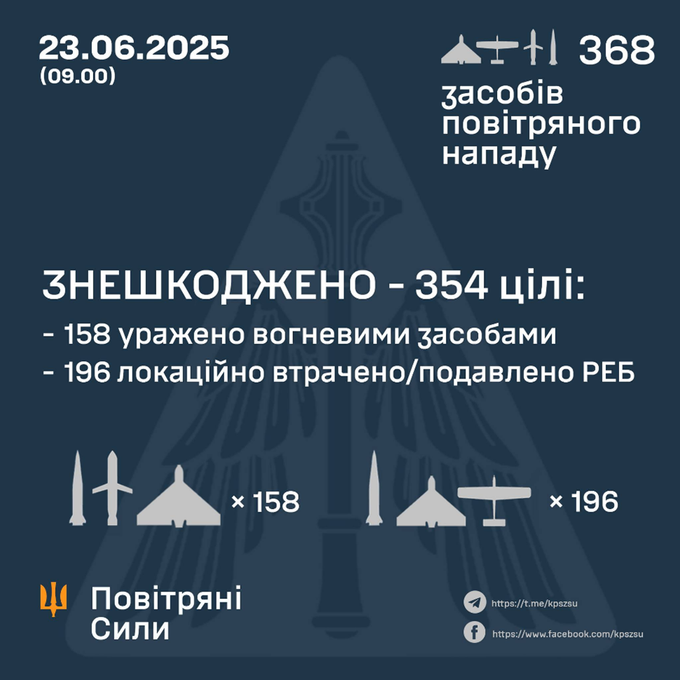 У ніч на 23 червня Сили Протиповітряної оборони України знешкодили 354 засоби повітряного нападу противника, 158 збито вогневими засобами, 196 – локаційно втрачені. Про це повідомляє ІА «Ре-Інформ» з посиланням на фейсбук-сторінку Командування повітряних сил ЗСУ.