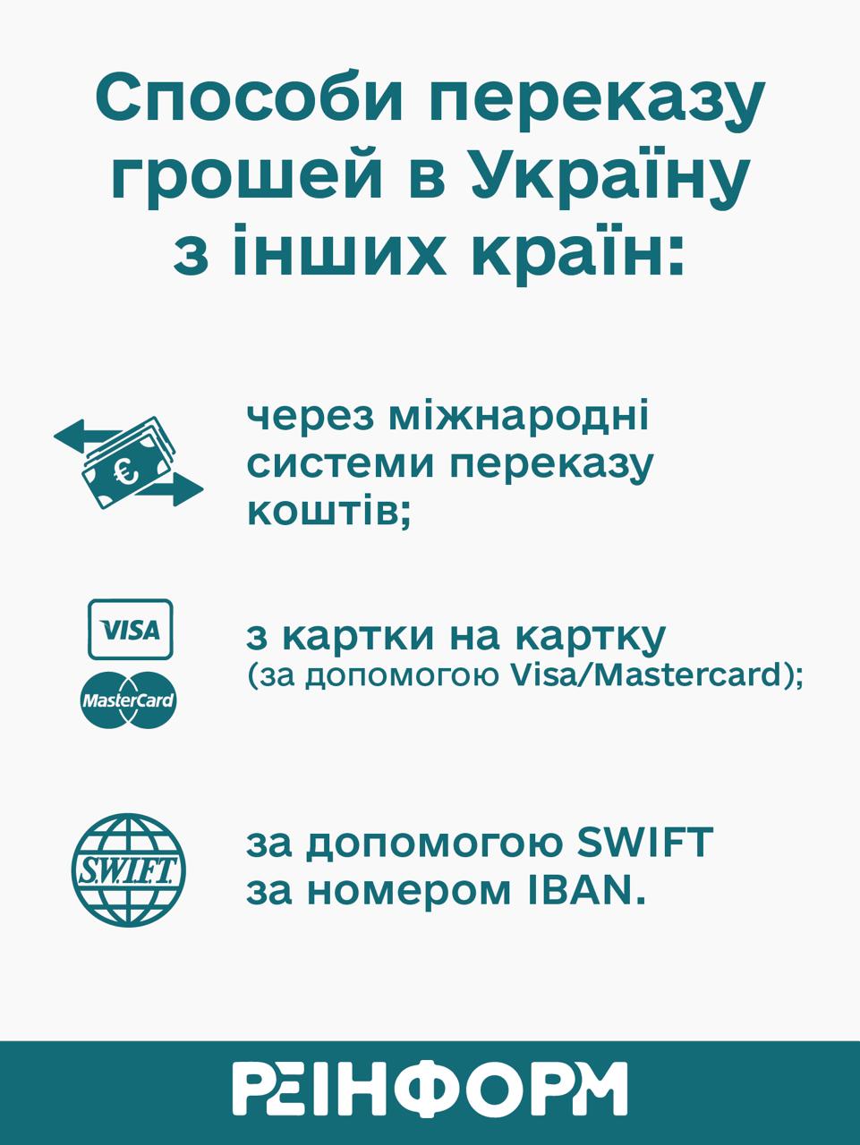 Для того аби зробити грошовий переказ з інших країн до України можна використати будь-яку міжнародну систему для переказу грошей. З більш детальною інформацією щодо всіх можливих варіантів переказу коштів ви можете ознайомитися на сайті Національного банку.