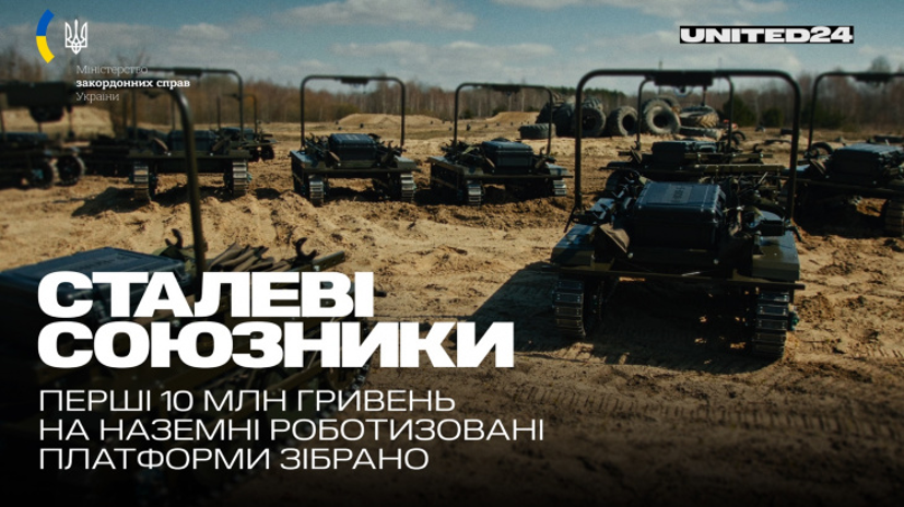 Міністерство внутрішніх справ повідомило, що спільний збір з United24 «Сталеві союзники» на наземні роботизовані платформи для наших захисників перевищив позначку 10 мільйонів гривень. Про це повідомляє МЗС України, передає ІА «Ре-Інформ».