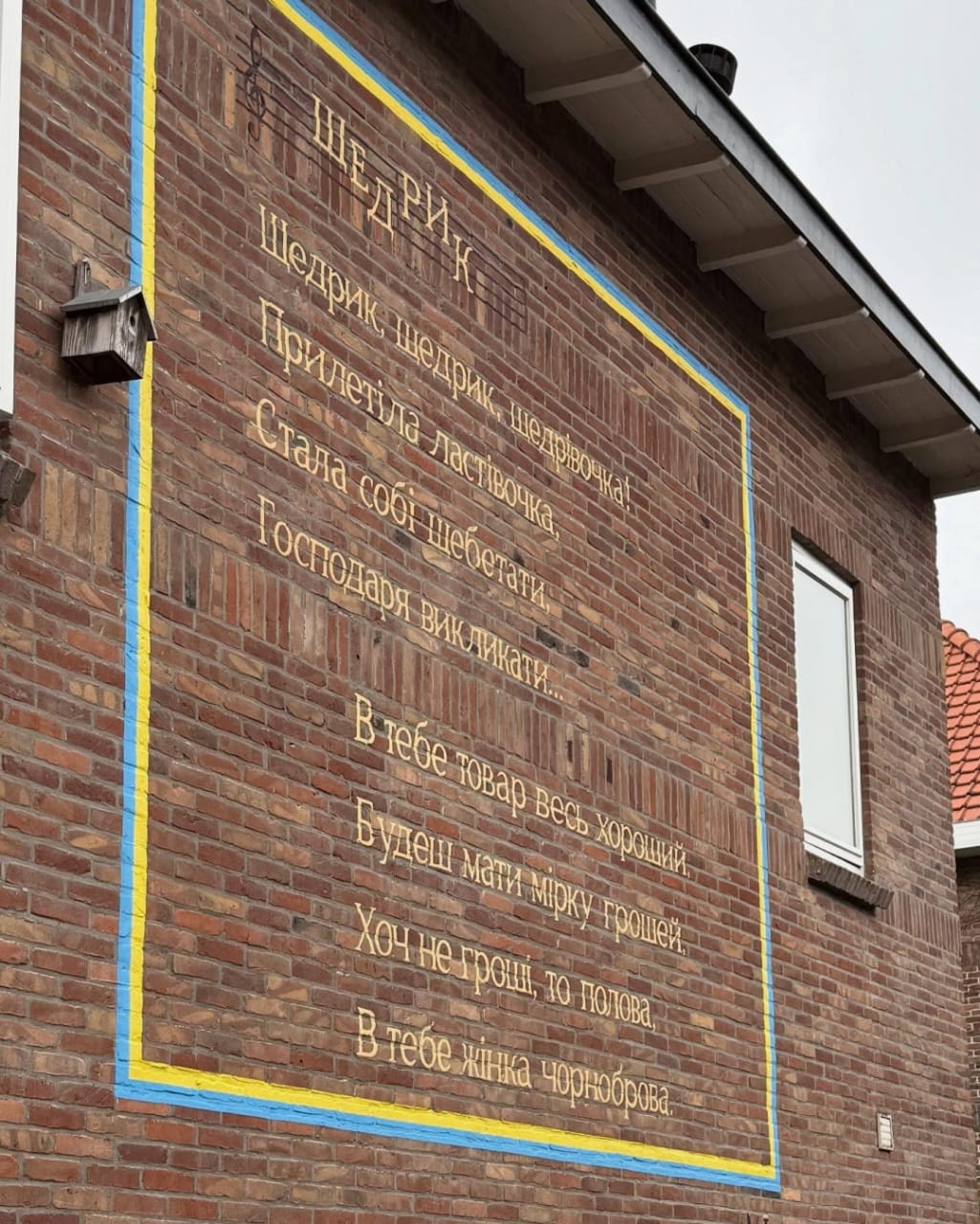 На стіні будівлі в Огстгесті, що в нідерландському місті Лейден, з’явилися слова всесвітньо відомої української колядки «Щедрик». Про це ІА «Ре-Інформ» повідомляє з посиланням на фейсбук-сторінку Посольства України в Нідерландах.