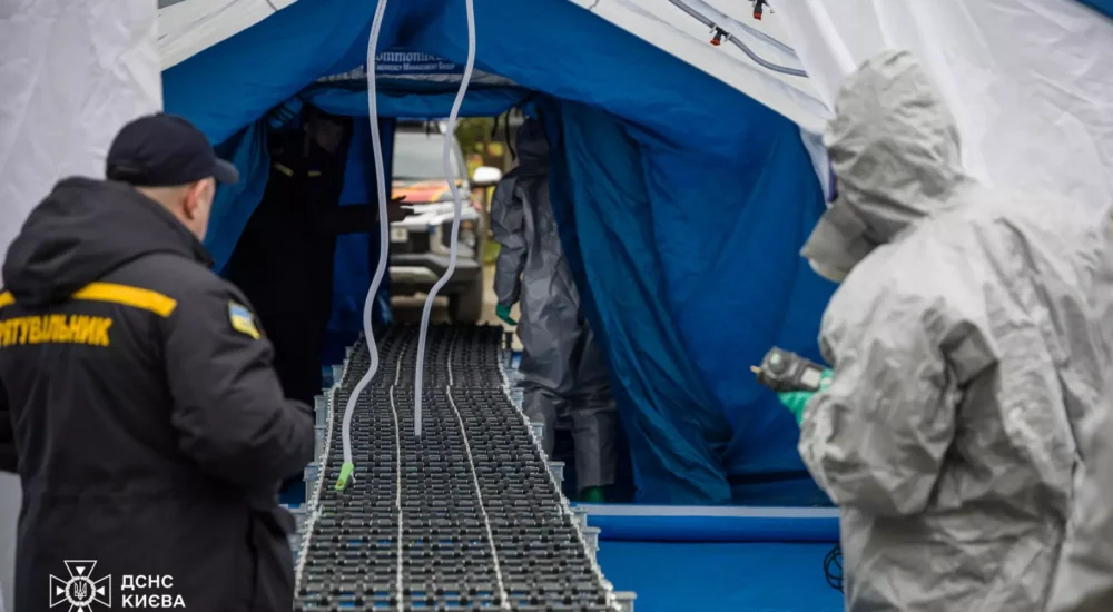За сценарієм навчань, після умовного влучання виникла радіаційна аварія. На місці інциденту рятувальники швидко розгорнули пункт масової деконтамінації – зону, де проводять санітарну обробку людей, які потрапили під вплив радіаційного забруднення.