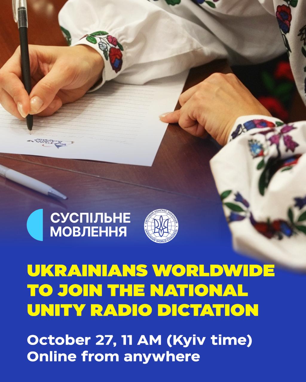 «Світове українство об’єднається в Радіодиктанті національної єдності! Як нитка, радіодиктант сплітає голоси десятків мільйонів українців по всьому світу у спільну національну ідею. Світовий конгрес українців разом із «Суспільним» підтримує ініціативу Радіодиктанту національної єдності та запрошує українців з усіх країн світу долучитися до флешмобу», —йдеться у повідомленні.