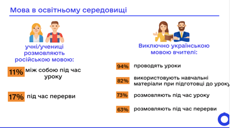 Окрім цього, 94% вчителів проводять уроки виключно українською мовою, а 63% розмовляють солов’їною під час перерв.