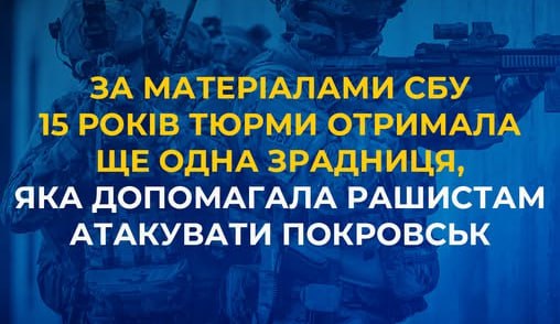 Суд призначив 15 років позбавлення волі з конфіскацією майна ще одній агентці рф, яка коригувала ворожі удари по Донеччині, зокрема по Покровську. Вирок ухвалили на підставі доказової бази, зібраної Службою безпеки України. Про це повідомляє СБУ, передає ІА «Ре-Інформ».