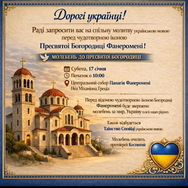 17 січня в одному з головних соборів Греції — Панагія Фанеромені в Неа Міханіоні зберуться на спільну молитву українською мовою за мир і процвітання України. Про це на своїй фейсбук-сторінці повідомляє Консульство України в Салоніках, передає ІА «Ре-Інформ».