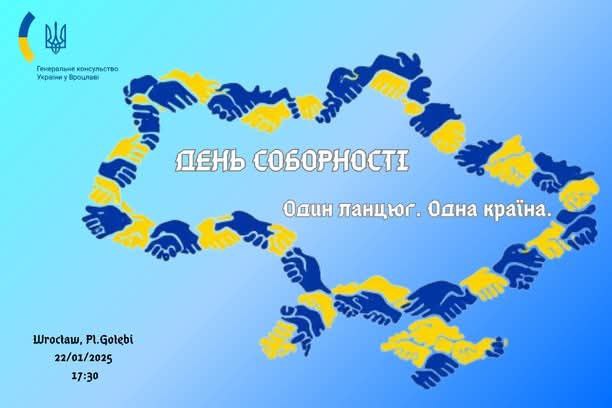 22 січня українська громада Вроцлава відзначить День Соборності України низкою урочистих і меморіальних заходів. Програма передбачає спільну молитву за Україну і традиційну акцію «Ланцюг Єдності». Про це на своїй фейсбук-сторінці повідомило Генеральне консульство України у Вроцлаві, передає ІА «Ре-Інформ».