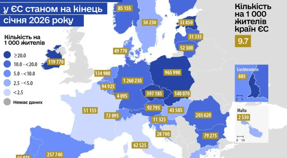 За даними Eurostat, протягом 2025 року країни ЄС ухвалили 683 395 нових рішень про надання тимчасового захисту громадянам України, що на 14% менше порівняно з 2024 роком. При цьому станом на кінець січня 2026 року кількість українців із таким статусом у ЄС зросла на 23 110 осіб порівняно з кінцем грудня 2025 року.
