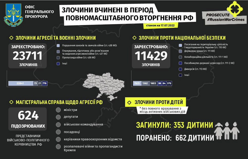 На сьогоднішній день, 17 липня, в Офісі Генерального прокурора задокументовано 23711 злочинів агресії рф та воєнних злочинів, а також 11429 злочинів проти національної безпеки України. Про це повідомляє РеІнформ з посиланням на пресслужбу відомства.