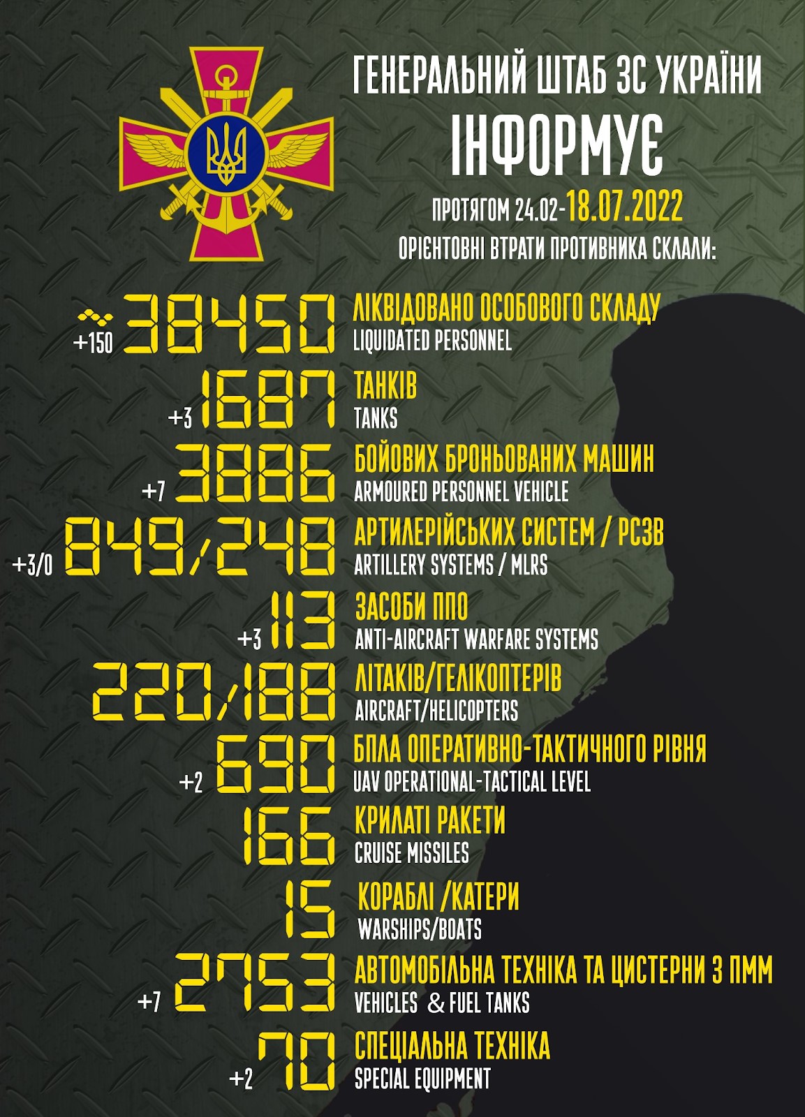 Від початку повномасштабної агресії проти України, з 24 лютого по 18 липня, підтверджені втрати особового складу військ рф склали 38 450 осіб. Про це повідомляє РеІнформ із посиланням на Генеральний штаб ЗСУ.