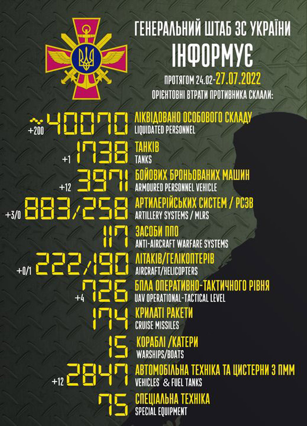 В результаті бойових дій минулої доби ворог зазнав втрат у живій силі, які орієнтовно становлять 200 осіб. Найбільше знищено військ окупанта на Криворізькому напрямку.
