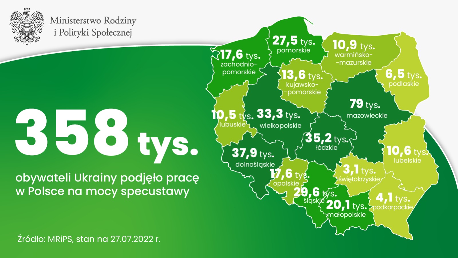 Найбільше українців —79 тис. — знайшли роботу в Мазовецькому воєводстві (центр — Варшава). Серед лідерів також воєводства Нижньосілезьке (Вроцлав) — 37,9 тис., Лодзьке — 35,2 тис. та Великопольське (Познань) —33,3 тис.