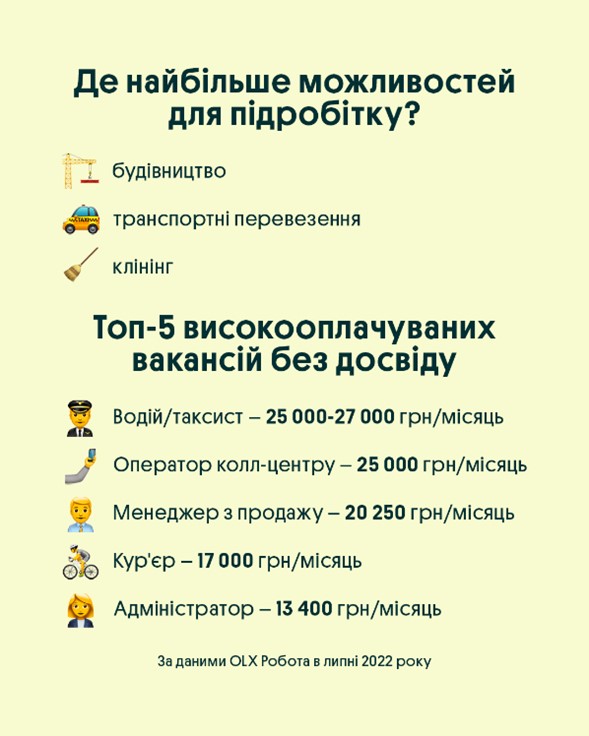 При цьому були й можливості неповної зайнятості для неробітничих спеціальностей. Зокрема, на «OLX Робота» у липні розмістили багато варіантів для репетиторів, яким пропонували 175-215 гривень за годину роботи. Менеджери з продажу щомісяця за умов часткової зайнятості могли отримувати до 11 000 гривень.